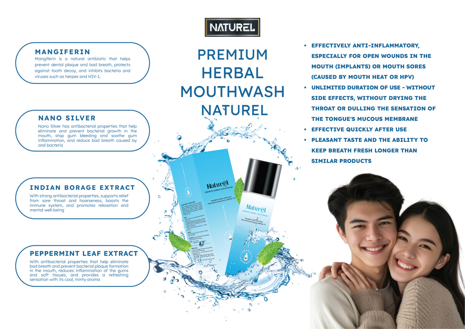 Another signature product of Naturel VN, the Premium Herbal Mouthwash marks a breakthrough in herbal-based oral care. Free from alcohol and formulated with rare herbal extracts together with Mangeferin – the best natural antibiotic – the product not only cleanses the oral cavity but also supports patients in treating oral conditions such as sore throat, gingivitis, and mouth ulcers. It accelerates wound healing, prevents infection, and effectively reduces pain for those facing oral health issues. The product is safe for both adults and children, with no side effects. It is highly recommended for individuals requiring premium quality oral care in complex oral health conditions, compared to conventional alcohol-based mouthwashes.